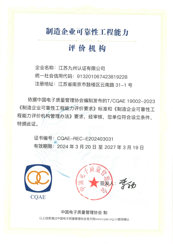 • 制造企業(yè)可靠性工程能力評價機(jī)構(gòu)證書